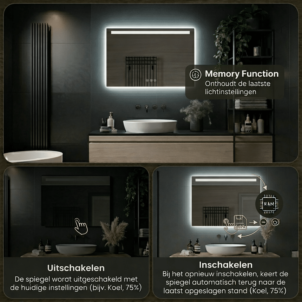 Dankzij de geïntegreerde LED-technologie biedt deze badkamerspiegel met verlichting de mogelijkheid om de kleurtemperatuur in te stellen, van warm wit tot helder koud wit. De dimfunctie zorgt ervoor dat je altijd de juiste lichtintensiteit kunt kiezen. Bovendien onthoudt de geheugenfunctie jouw laatste instellingen, zodat je verlichting altijd meteen naar wens is.