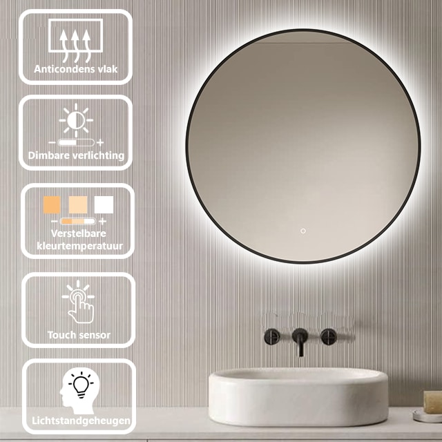 Deze badkamerspiegel met LED-verlichting beschikt over een dimbare lichtfunctie en een instelbare kleurtemperatuur, variërend van warm wit tot helder koud wit. Dankzij de geheugenfunctie onthoudt de spiegel jouw laatste instellingen, zodat je verlichting altijd direct goed staat.