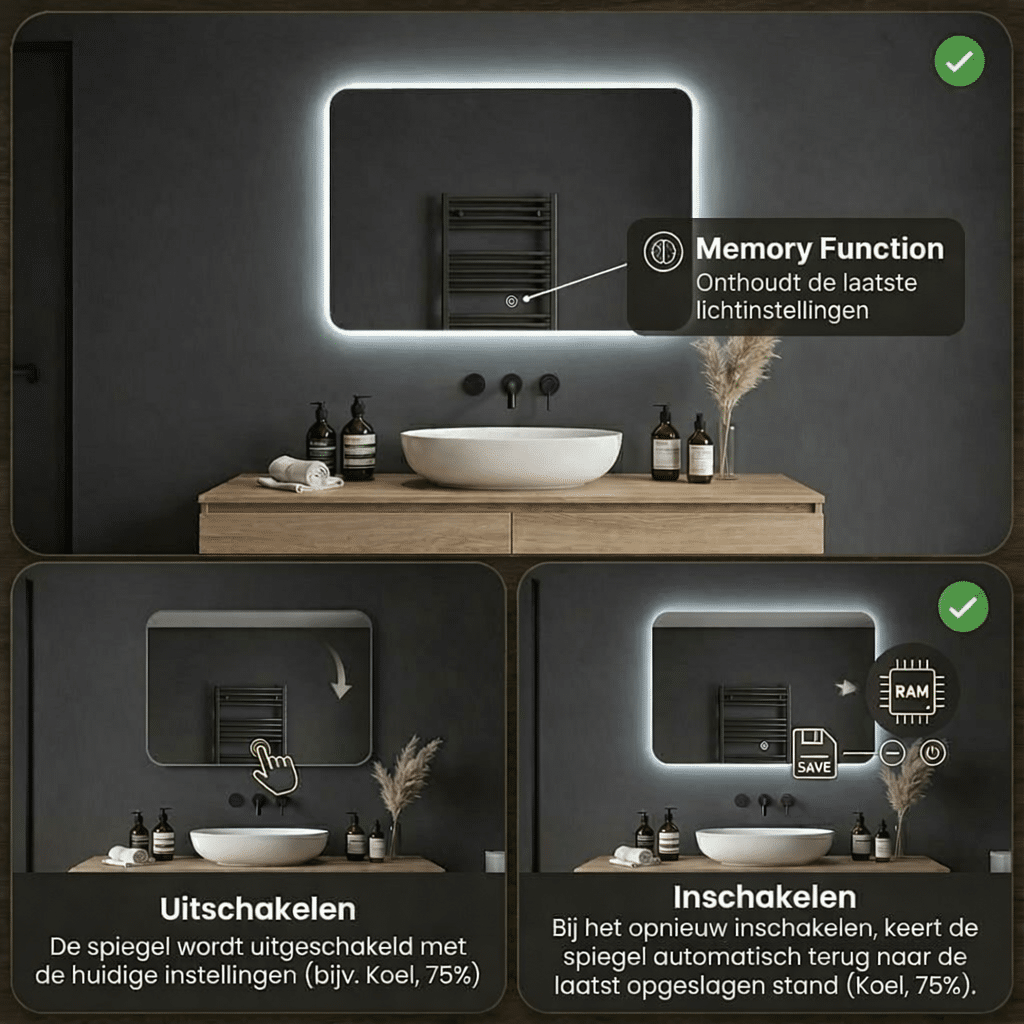 De spiegel wordt geleverd met een duidelijke handleiding en is eenvoudig te monteren. Bediening kan via de touch-knop of een wandschakelaar.