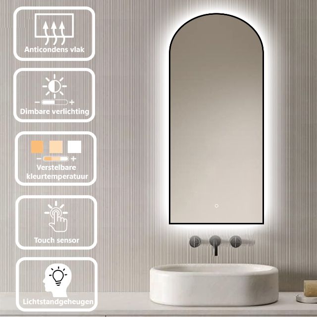 Geef je badkamer een luxe upgrade met de Badkamerspiegel Marrakech 45×100 van LoXa. Ervaar zelf het verschil dat deze hoogwaardige boogvormige spiegel met zwarte omlijsting en verstelbare verlichting maakt en transformeer je dagelijkse routine in een luxe beleving!