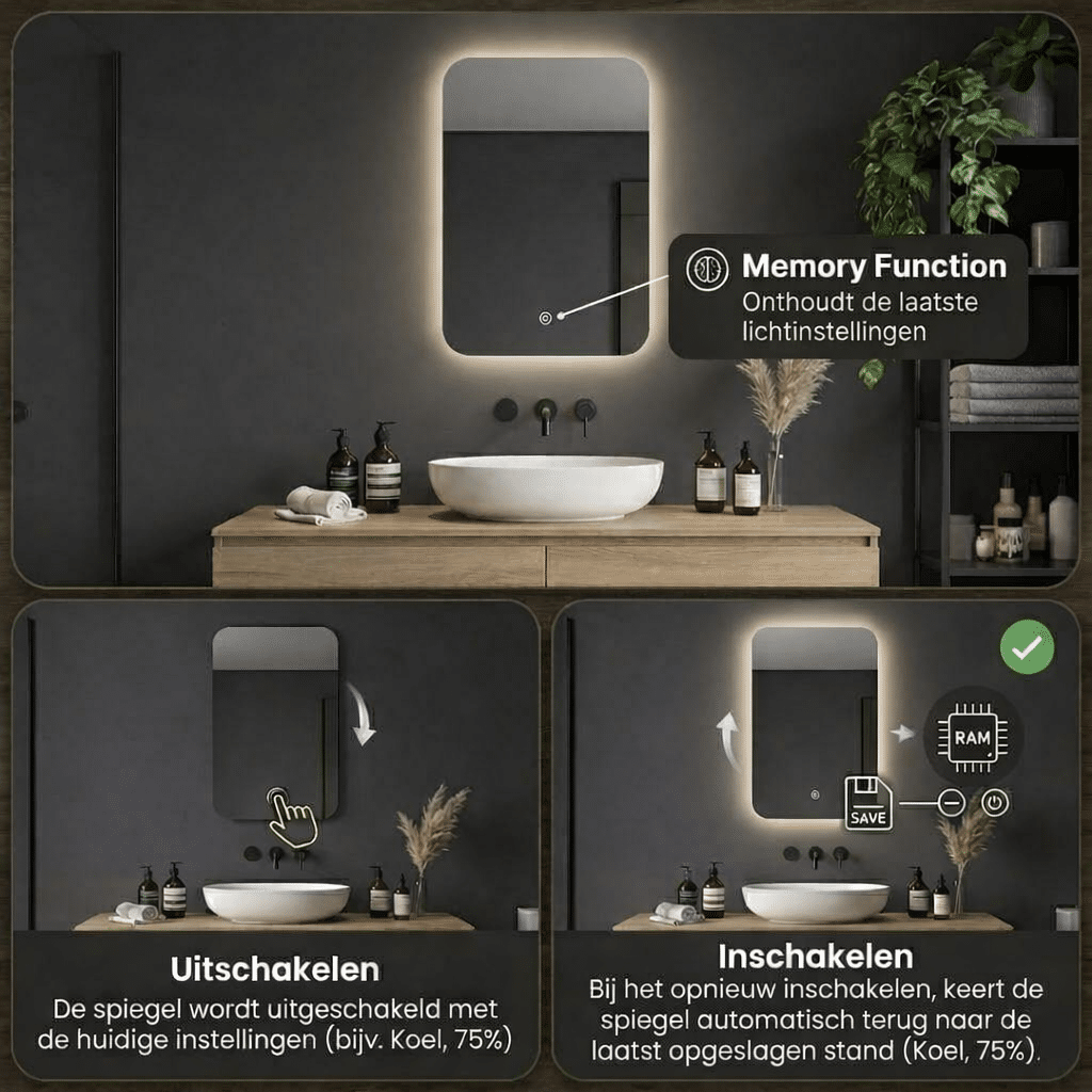 De spiegel wordt geleverd met een duidelijke handleiding en is eenvoudig te monteren. Bediening kan via de touch-knop of een wandschakelaar.
