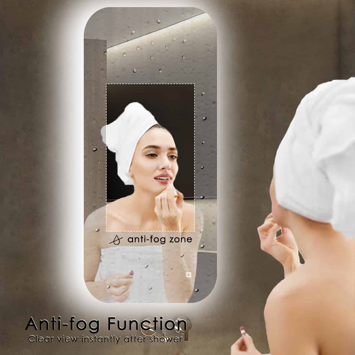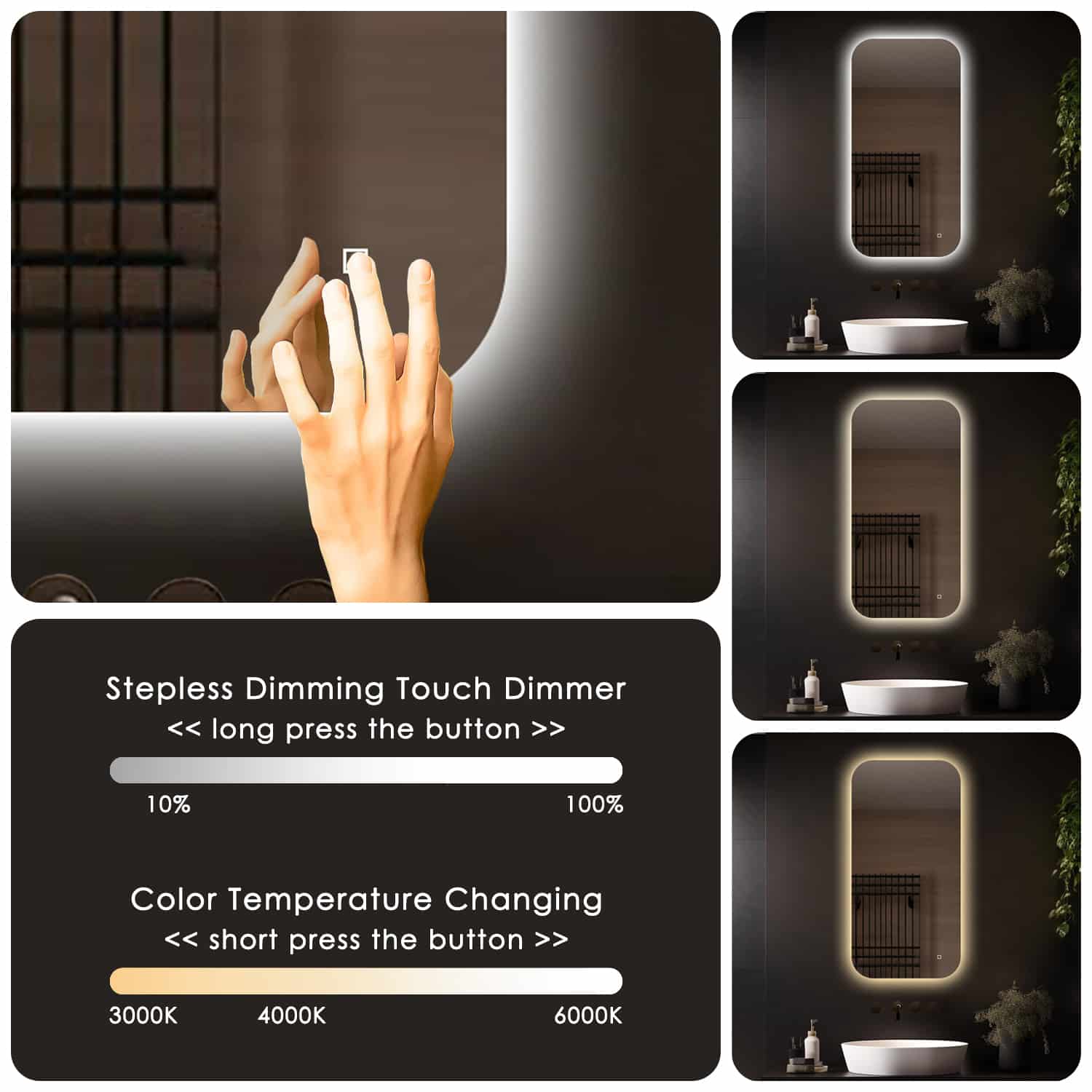 Wat deze Badkamerspiegel Moderna echt bijzonder maakt, is de geïntegreerde LED-verlichting rondom met een verstelbare kleurtemperatuur van 3000K tot 6000K. Of je nu kiest voor warm wit licht voor een ontspannen sfeer of helder wit licht voor nauwkeurige gezichtsverzorging, de keuze is aan jou. Bovendien is de verlichting dimbaar, zodat je altijd de perfecte lichtintensiteit kunt instellen. De bediening gaat eenvoudig via de aan/uit-schakelaar direct op de spiegel.