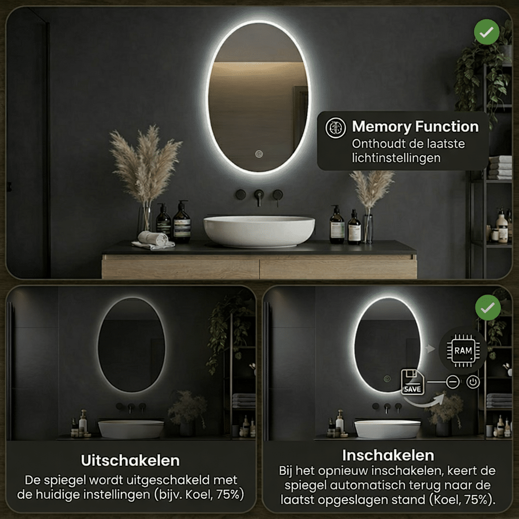 Via de intelligente touch-knop stel je gemakkelijk de lichtintensiteit en kleurtemperatuur in. De geheugenfunctie onthoudt je laatst gebruikte instellingen, zodat je elke dag met jouw perfecte lichtstart begint.