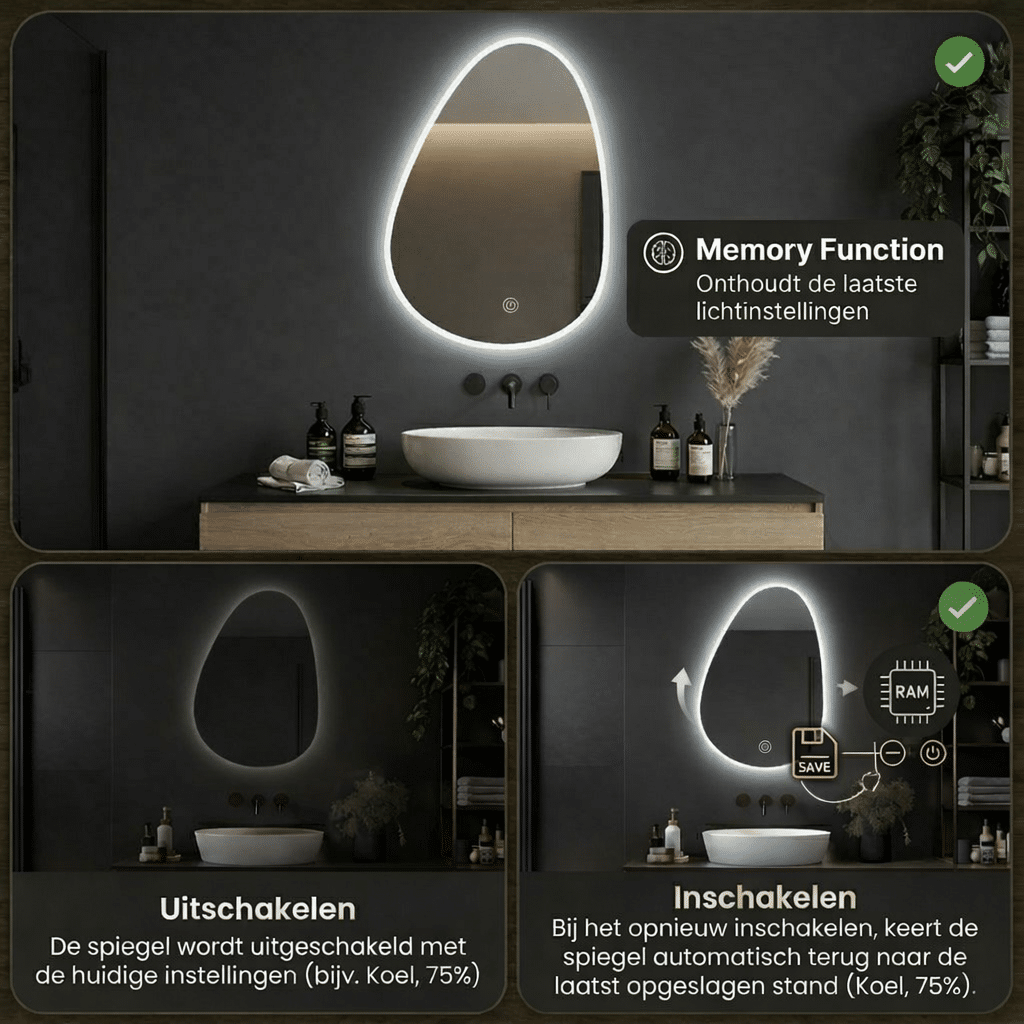 Bedien de spiegel via de intelligente touch-knop op het oppervlak. Hiermee stel je moeiteloos de lichtsterkte en kleurtemperatuur in. De geheugenfunctie slaat jouw voorkeur op, zodat je elke dag start met jouw ideale lichtinstelling.