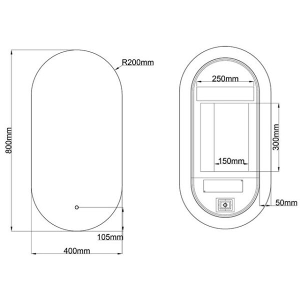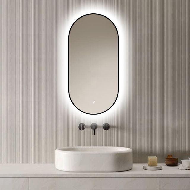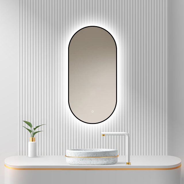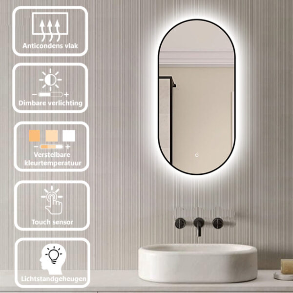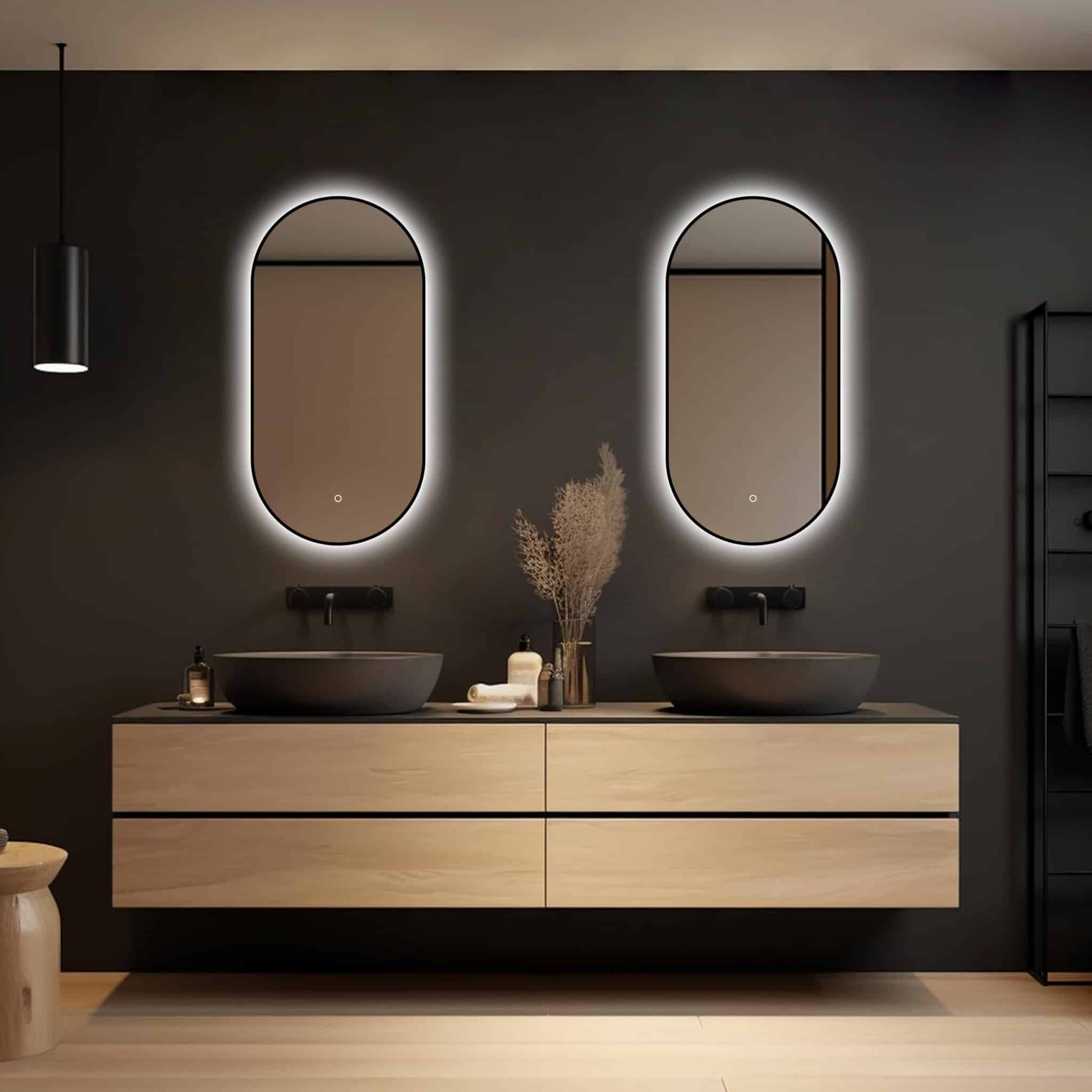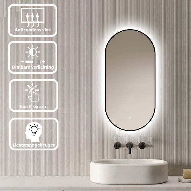 Badkamerspiegel Vienna 40×80 van LoXa – Ovale Spiegel met Zwarte Omlijsting en LED-Verlichting