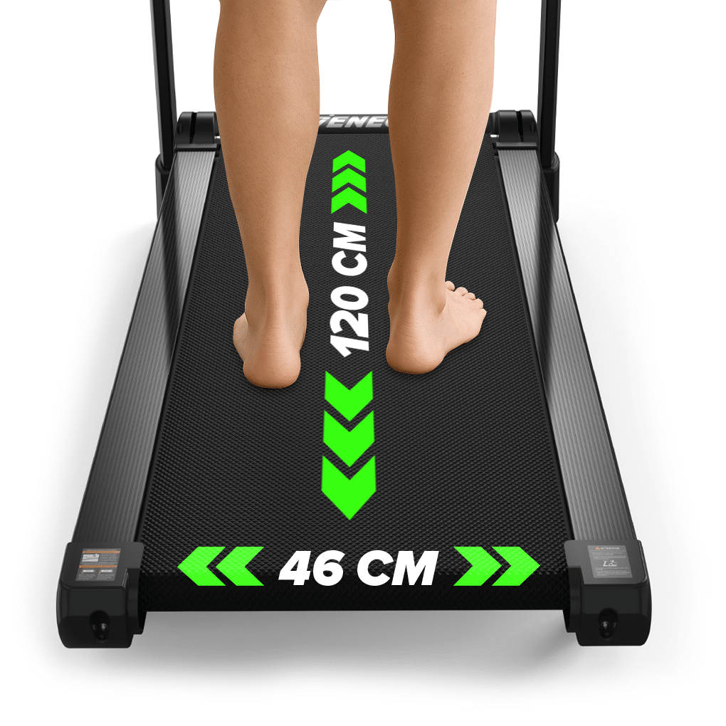 Het ruime loopvlak van 120 × 46 cm en de 5-laagse schokdemping zorgen voor een natuurlijke, gewrichtsvriendelijke loopervaring. Het robuuste stalen frame garandeert stabiliteit, zelfs bij hogere snelheden. Dankzij de zachte handrail met geïntegreerde bediening houd je controle over snelheid en helling tijdens je training.