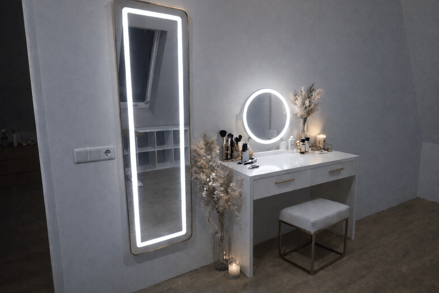 Plaats de spiegel vrijstaand met de stevige standaard of hang hem op aan de muur met het slimme ophangsysteem. Beide opties zijn eenvoudig en stabiel.